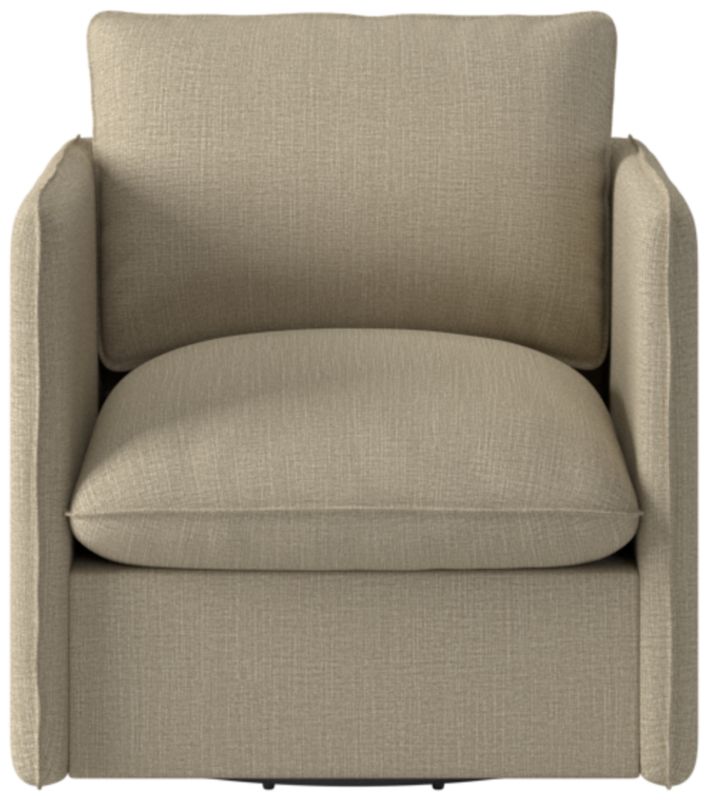 Richly textured upholstery, a smooth 360-degree swivel and pillowy cushions make this Italian-inspired swivel chair an instant classic. Assembled in Mississippi, the frame is benchmade with kiln-dried hardwood certified sustainable by the Forest Stewardship Council ® (FSC). Transitioning seamlessly between formal and informal settings, the slim silhouette offers a modern aesthetic, while flange seams nod to more traditional influences. CB2 exclusive.