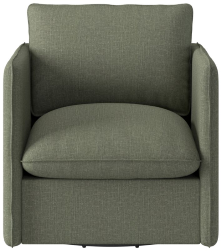 Richly textured upholstery, a smooth 360-degree swivel and pillowy cushions make this Italian-inspired swivel chair an instant classic. Assembled in Mississippi, the frame is benchmade with kiln-dried hardwood certified sustainable by the Forest Stewardship Council ® (FSC). Transitioning seamlessly between formal and informal settings, the slim silhouette offers a modern aesthetic, while flange seams nod to more traditional influences. CB2 exclusive.