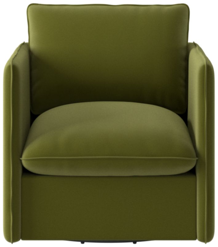 Richly textured upholstery, a smooth 360-degree swivel and pillowy cushions make this Italian-inspired swivel chair an instant classic. Assembled in Mississippi, the frame is benchmade with kiln-dried hardwood certified sustainable by the Forest Stewardship Council ® (FSC). Transitioning seamlessly between formal and informal settings, the slim silhouette offers a modern aesthetic, while flange seams nod to more traditional influences. CB2 exclusive.
