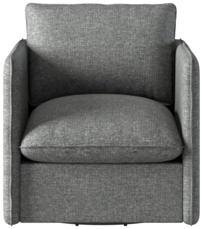 Richly textured upholstery, a smooth 360-degree swivel and pillowy cushions make this Italian-inspired swivel chair an instant classic. Assembled in Mississippi, the frame is benchmade with kiln-dried hardwood certified sustainable by the Forest Stewardship Council ® (FSC). Transitioning seamlessly between formal and informal settings, the slim silhouette offers a modern aesthetic, while flange seams nod to more traditional influences. CB2 exclusive.