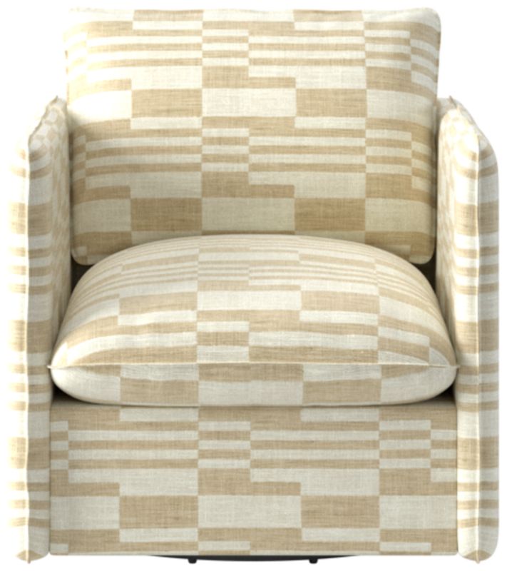 Richly textured upholstery, a smooth 360-degree swivel and pillowy cushions make this Italian-inspired swivel chair an instant classic. Assembled in Mississippi, the frame is benchmade with kiln-dried hardwood certified sustainable by the Forest Stewardship Council ® (FSC). Transitioning seamlessly between formal and informal settings, the slim silhouette offers a modern aesthetic, while flange seams nod to more traditional influences. CB2 exclusive.