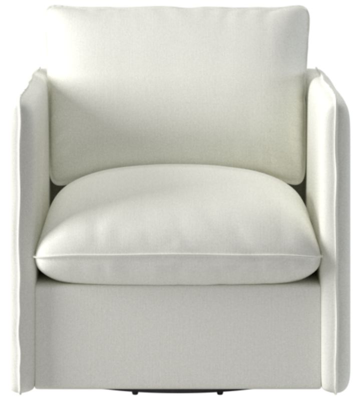 Richly textured upholstery, a smooth 360-degree swivel and pillowy cushions make this Italian-inspired swivel chair an instant classic. Assembled in Mississippi, the frame is benchmade with kiln-dried hardwood certified sustainable by the Forest Stewardship Council® (FSC). Transitioning seamlessly between formal and informal settings, the slim silhouette offers a modern aesthetic, while flange seams nod to more traditional influences. CB2 exclusive.