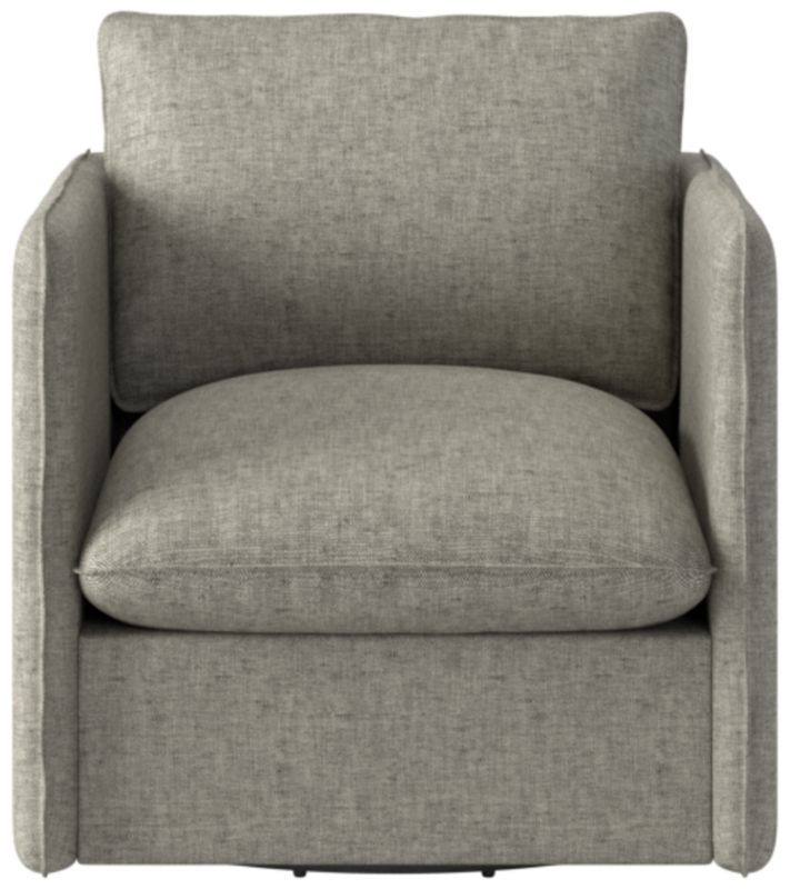 Richly textured upholstery, a smooth 360-degree swivel and pillowy cushions make this Italian-inspired swivel chair an instant classic. Assembled in Mississippi, the frame is benchmade with kiln-dried hardwood certified sustainable by the Forest Stewardship Council ® (FSC). Transitioning seamlessly between formal and informal settings, the slim silhouette offers a modern aesthetic, while flange seams nod to more traditional influences. CB2 exclusive.