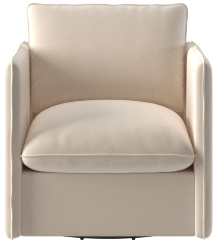 Richly textured upholstery, a smooth 360-degree swivel and pillowy cushions make this Italian-inspired swivel chair an instant classic. Assembled in Mississippi, the frame is benchmade with kiln-dried hardwood certified sustainable by the Forest Stewardship Council® (FSC). Transitioning seamlessly between formal and informal settings, the slim silhouette offers a modern aesthetic, while flange seams nod to more traditional influences. CB2 exclusive.