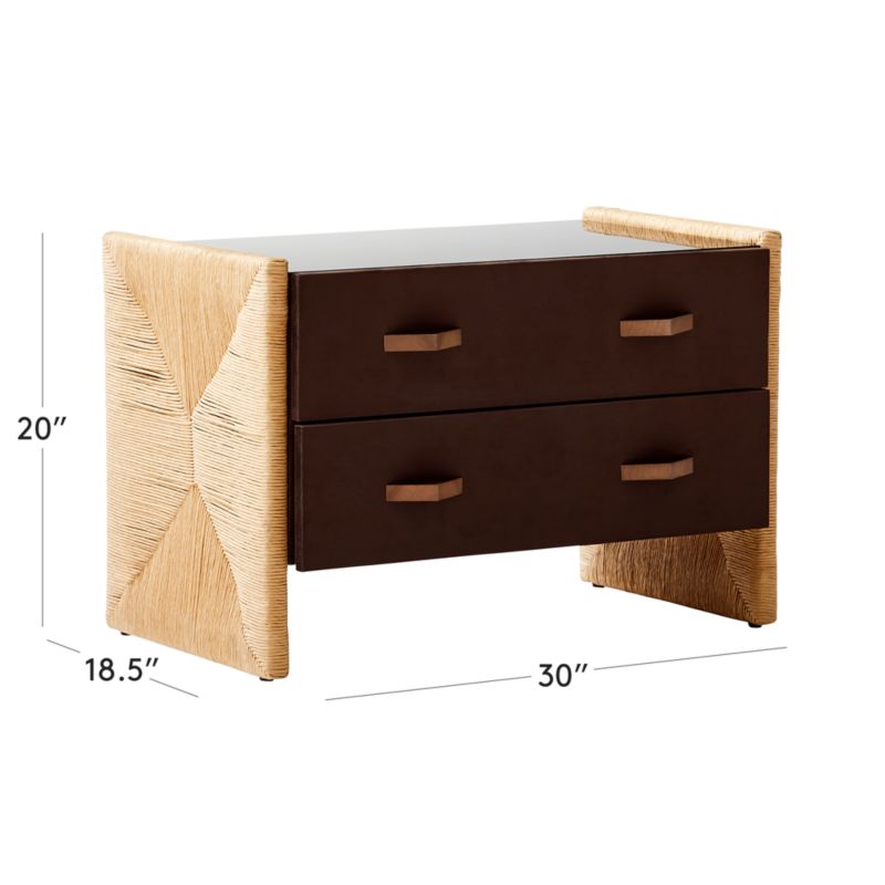 Inspired by Danish midcentury and '70s modern, Kravitz Design nightstand exemplifies the sophistication of contrast. Paper cord sides, woven from a traditional Scandinavian material, and solid ash front provide an earthy contrast to luxe fabric-fronted drawers and bronze mirrored top. Wood handles stained dark walnut complete the picture. CB2 exclusive.
