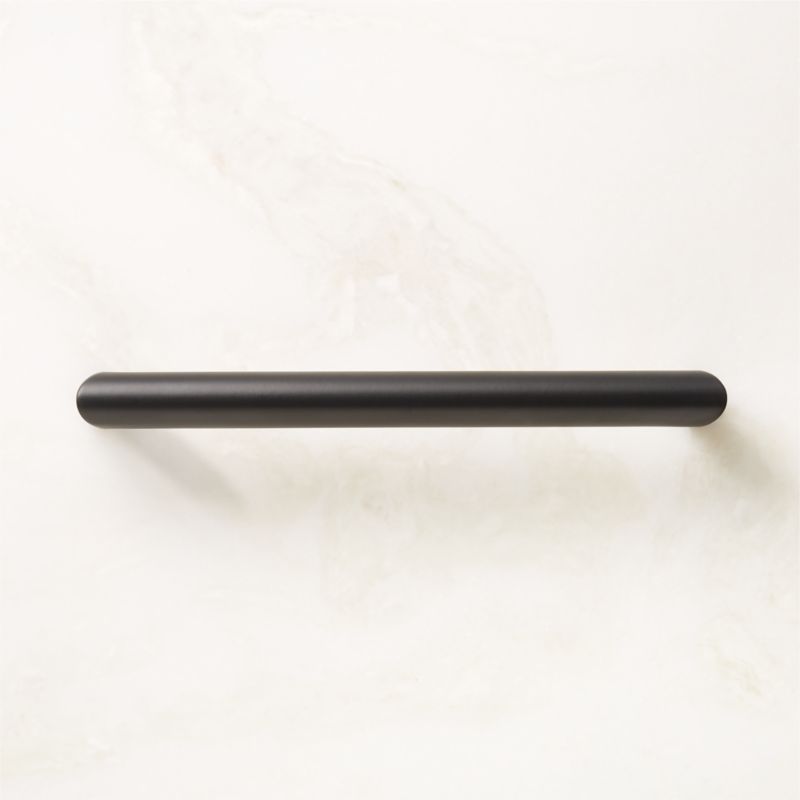 Crafted of solid brass, curved black cabinet handle by Barcelona-based Mermelada Estudio evokes a modern sensibility. Pair with the Curveaux knob for a cohesive look. CB2 exclusive.