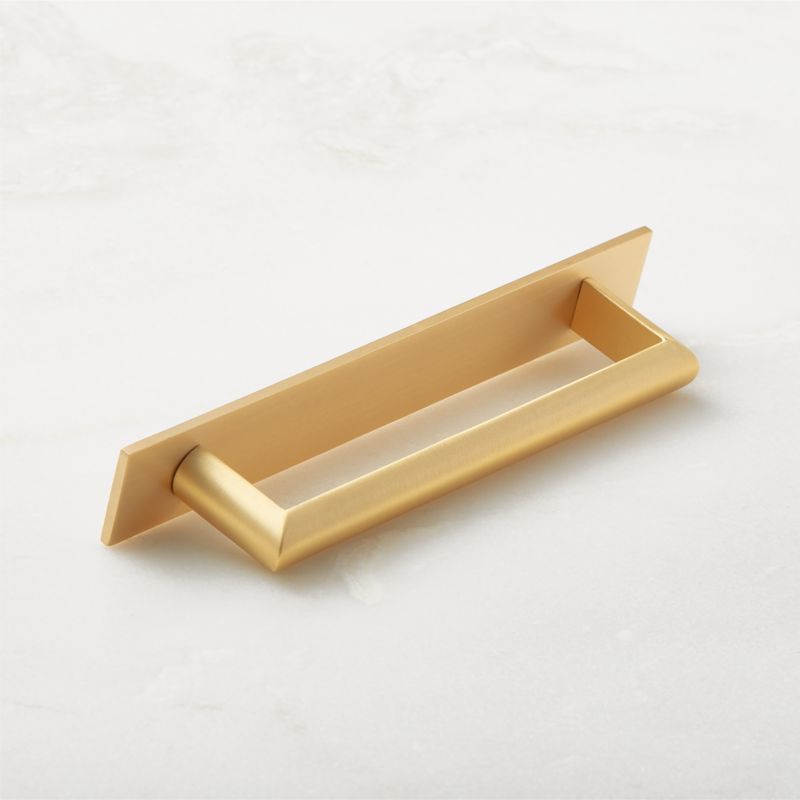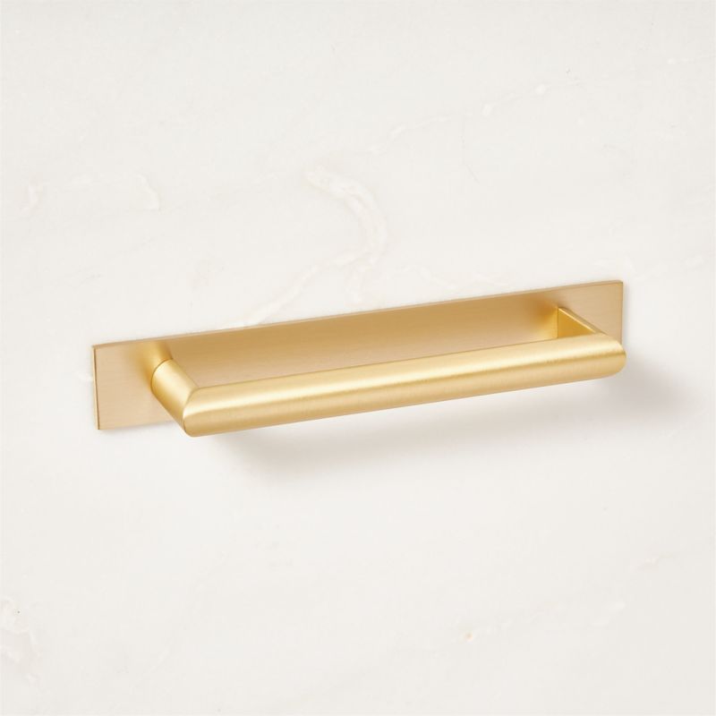 Crafted of solid brass, curved brushed brass handle by Barcelona-based Mermelada Estudio evokes a modern sensibility. Pair with the Curveaux knob for a cohesive look. CB2 exclusive.