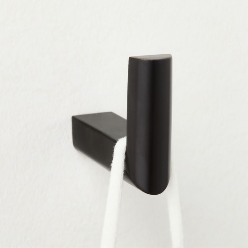 Sleek black towel hook by Barcelona-based Mermelada Estudio curves seamlessly toward the wall for a modern look. CB2 exclusive.