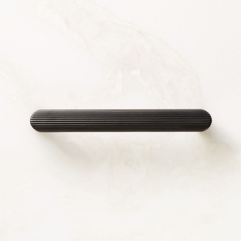 Crafted of solid brass, curved black cabinet handle by Barcelona-based Mermelada Estudio is scored with bold lines for a modern sensibility. Pair with the Curveaux scored knob for a cohesive look. CB2 exclusive.