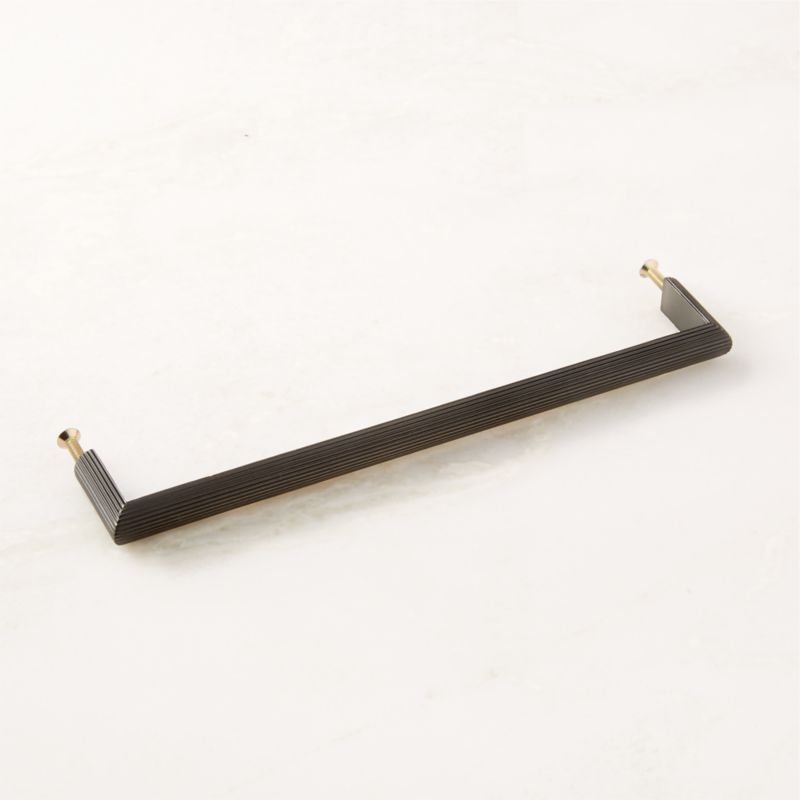 Crafted of solid brass, curved black cabinet handle by Barcelona-based Mermelada Estudio is scored with bold lines for a modern sensibility. Pair with the Curveaux scored knob for a cohesive look. CB2 exclusive.
