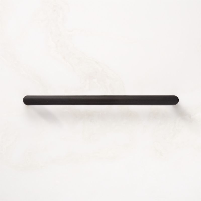 Crafted of solid brass, curved black cabinet handle by Barcelona-based Mermelada Estudio is scored with bold lines for a modern sensibility. Pair with the Curveaux scored knob for a cohesive look. CB2 exclusive.