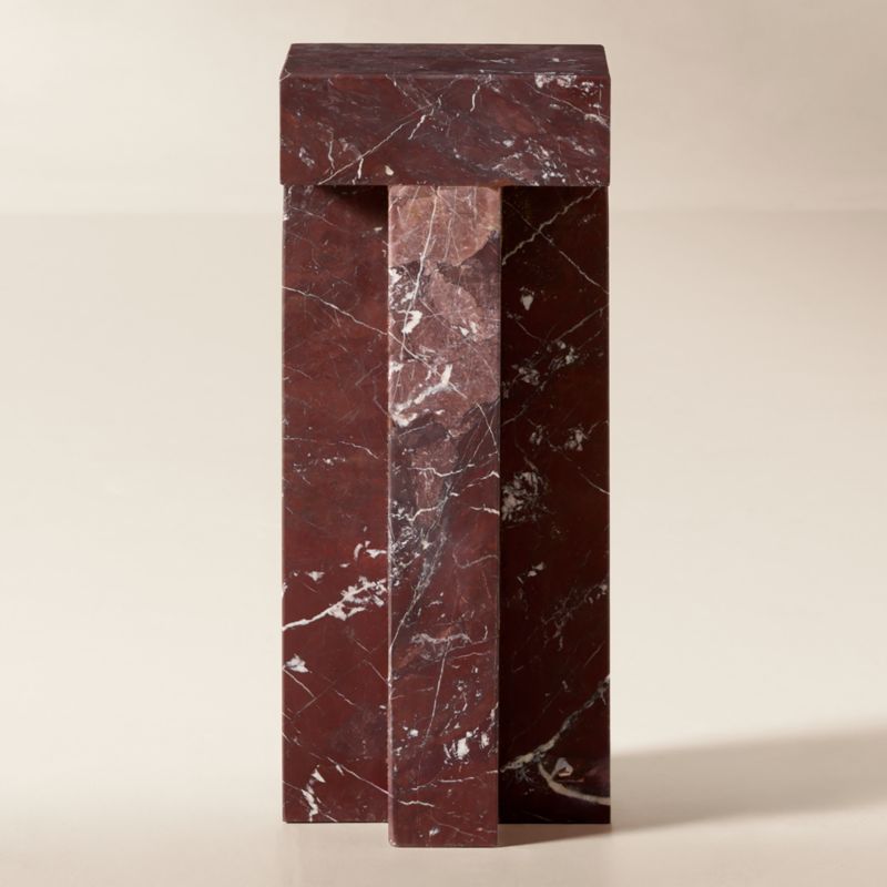Transitioning seamlessly from indoors to outdoors, sculptural square side table is carved from thick slabs of red marble with natural veining that showcases the stone and makes each table unique. CB2 exclusive.