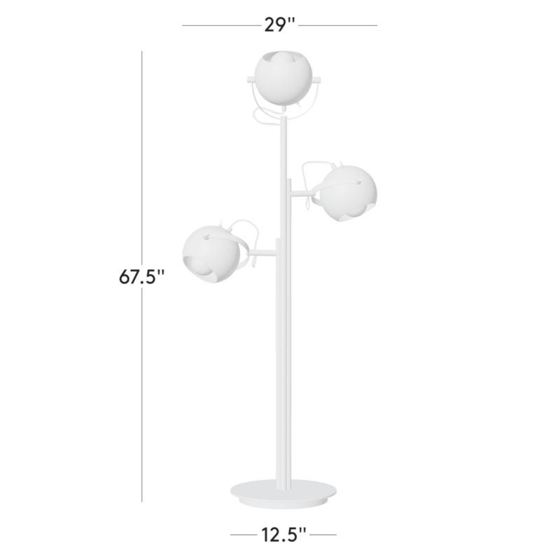 Jannis Ellenberger's task floor lamp is a modern interpretation of iconic space-age motifs. Three globe shades are suspended by stainless steel rods in a design reminiscent of a spacesuit helmet or the Sputnik 1 satellite. Shades are finished with white enamel—an artful process where layers of thick enamel swirl over an iron base. When fired, the enamel settles, surfacing organic highs and lows in the finish. Effortlessly adjustable, swiveling globe shades can be turned on/off individually with a rotary switch on the back. CB2 exclusive.