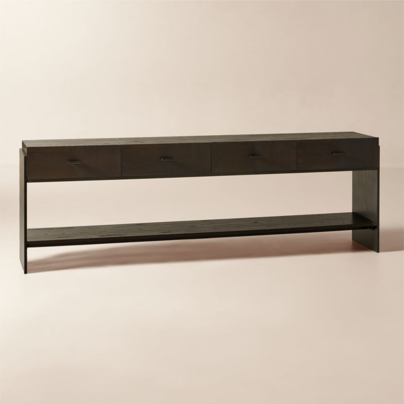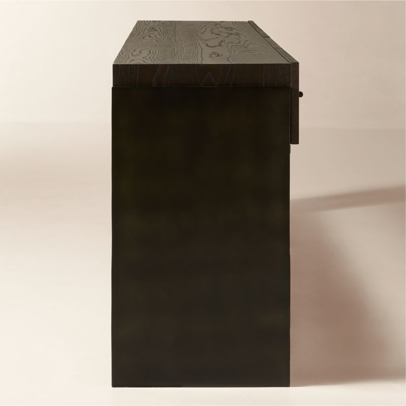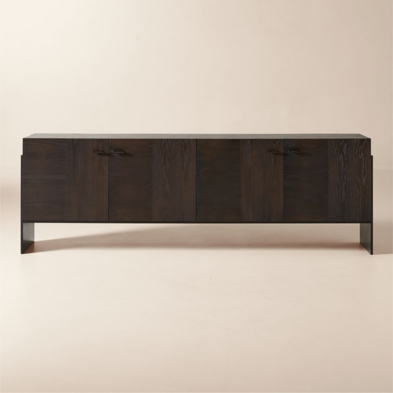 Crafted of FSC ®-certified oak, modern credenza by NYC-based Aguirre Design is defined by a sleek, long profile. Four doors with blackened metal pulls provide ample storage with four adjustable shelves inside. Finished in a dark stain, the door fronts feature an alternating wood grain, creating a subtle, organic pattern that adds an elevated touch. CB2 exclusive.