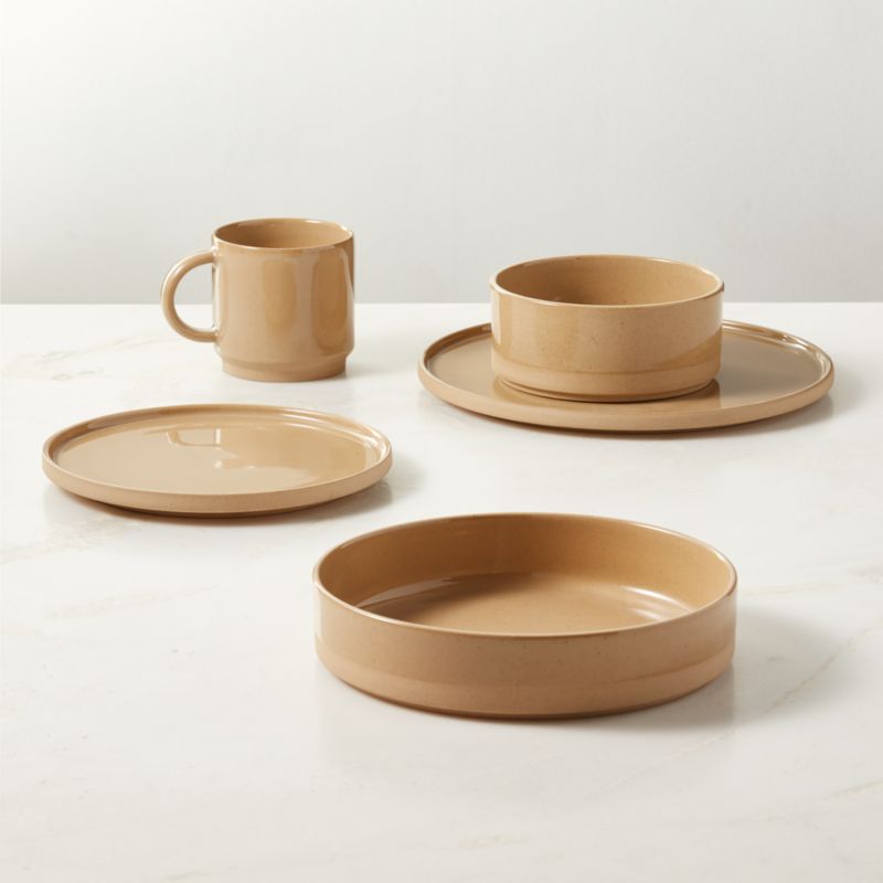 Sand-colored recycled stoneware sets a refined yet relaxed table in a natural palette. Crafted in Portugal, the stackable dinnerware set is made of Ecogres®, a proprietary clay composed of 90% recycled materials. Unglazed on the exterior for a naturally tactile finish, the interior features a high-gloss glaze that highlights subtle black flecks in the clay. CB2 exclusive.