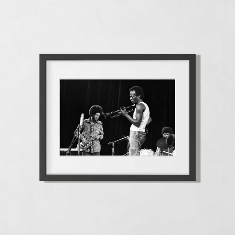 Jazz trumpeter and composer Miles Davis performs with Gary Bartz on saxophone and Jack DeJohnette on drums at the Tanglewood Music Festival in Lenox, Massachusetts. Part of CB2's collaboration with Sonic Editions, the image is printed and expertly mounted in a handcrafted wood frame.