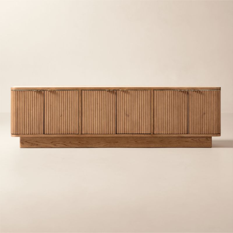 Designed by Studio ANANSI, the soft, fluid silhouette of the Davison media console makes a stunning statement. Fluted drawer fronts are complemented by polished unlacquered brass handles, offering a living finish that will develop the patina of a vintage find. Simply polish the brass to restore its original luster. CB2 exclusive.
