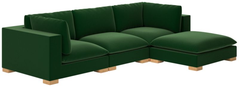 Upholstered in a charcoal performance velvet, large-scale sectional sits low to the ground for modern appeal. The plush silhouette features pillow-like detached cushions with broad armrests that can serve as a relaxed perch for socializing. Sectional pieces can be configured to suit your space. CB2 exclusive.