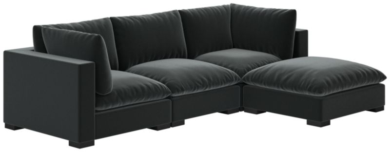 Upholstered in a lush grey performance velvet, sectional sofa sits low to the ground with pillow-like detached cushions and wide arms for modern appeal. French seams add a tailored finish. Featuring a shallower depth and higher seat than our original Deseo design, its smaller proportions are classic and no less dramatic. CB2 exclusive.