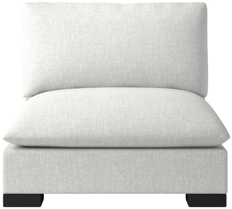 Upholstered in a charcoal performance velvet, large-scale armless chair sits low to the ground with pillow-like detached cushions for modern appeal. Combine with other Deseo sectional pieces for a configuration that suits your space. CB2 exclusive.