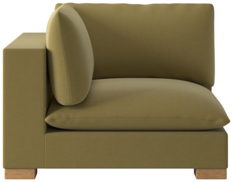 Upholstered in a charcoal performance velvet, large-scale corner chair sits low to the ground for modern appeal. The plush silhouette features pillow-like detached cushions with a broad armrest that can serve as a relaxed perch for socializing. Combine with other Deseo sectional pieces for a configuration that suits your space. CB2 exclusive.