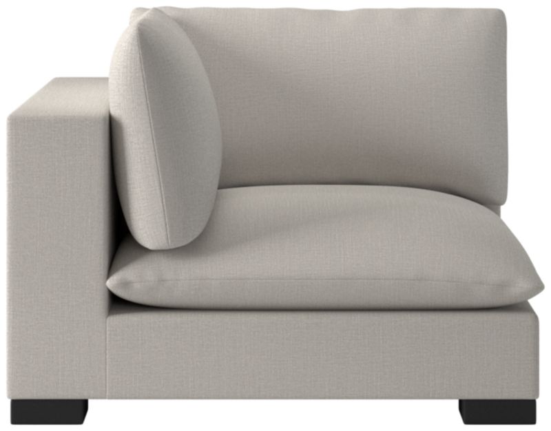 Upholstered in a charcoal performance velvet, large-scale corner chair sits low to the ground for modern appeal. The plush silhouette features pillow-like detached cushions with a broad armrest that can serve as a relaxed perch for socializing. Combine with other Deseo sectional pieces for a configuration that suits your space. CB2 exclusive.