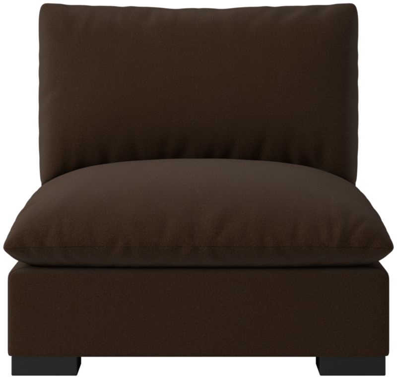 Upholstered in a lush grey performance velvet, armless chair sits low to the ground with pillow-like detached cushions and wide arms for modern appeal. French seams add a tailored finish. Featuring a shallower depth and higher seat than our original Deseo design, its smaller proportions are classic and no less dramatic. CB2 exclusive.