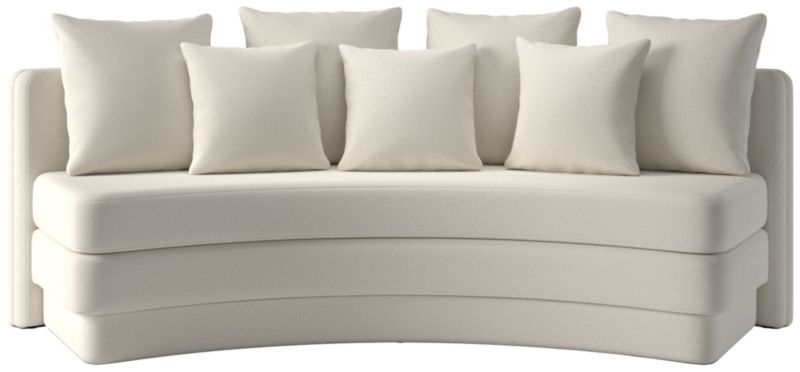 Designed for relaxed gatherings and everyday elegance, curved dining banquette by Studio ANANSI offers generous seating for four. Upholstered banquette balances sculptural form with inviting comfort. A thick bench-style seat cushion sits atop a fully upholstered plinth base, giving the appearance of a double-stacked silhouette for added visual weight. Finished with four oversized pillows and three smaller accent cushions, banquette pairs effortlessly with a round dining table. CB2 exclusive.
