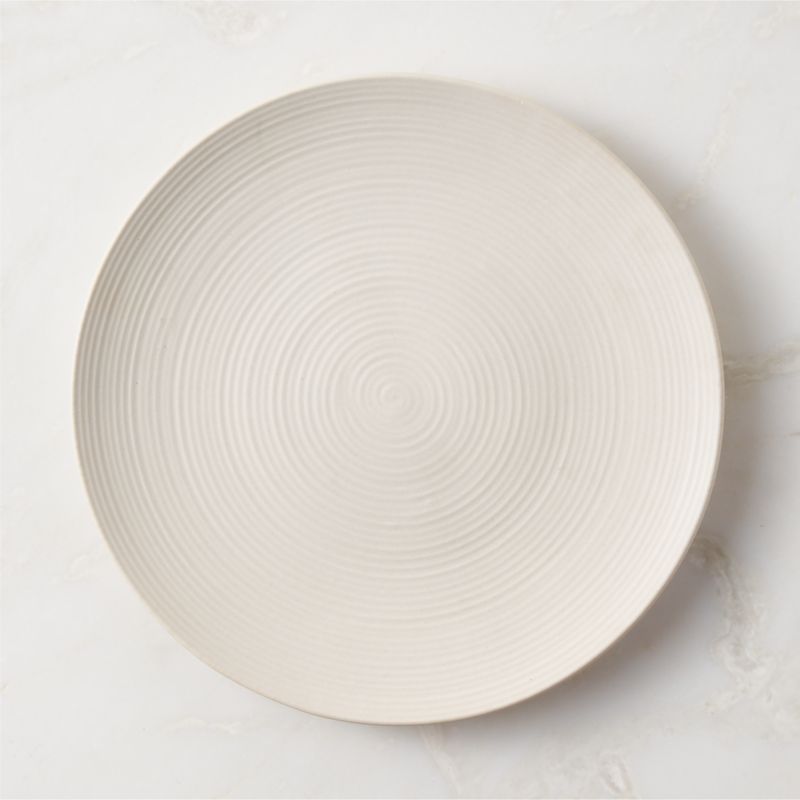 Designed by Brooklyn-based ceramicist Natalie Weinberger, modern dinner plate is inspired by NYC and the swell of downtown living. The tonal off-white plate is distinguished by subtly raised rings that ripple across the surface, giving the piece the casual appeal of hand-thrown pottery. Part of the Downtown dinnerware collection. For a coordinated look, pair with the Downtown glassware collection. CB2 exclusive.