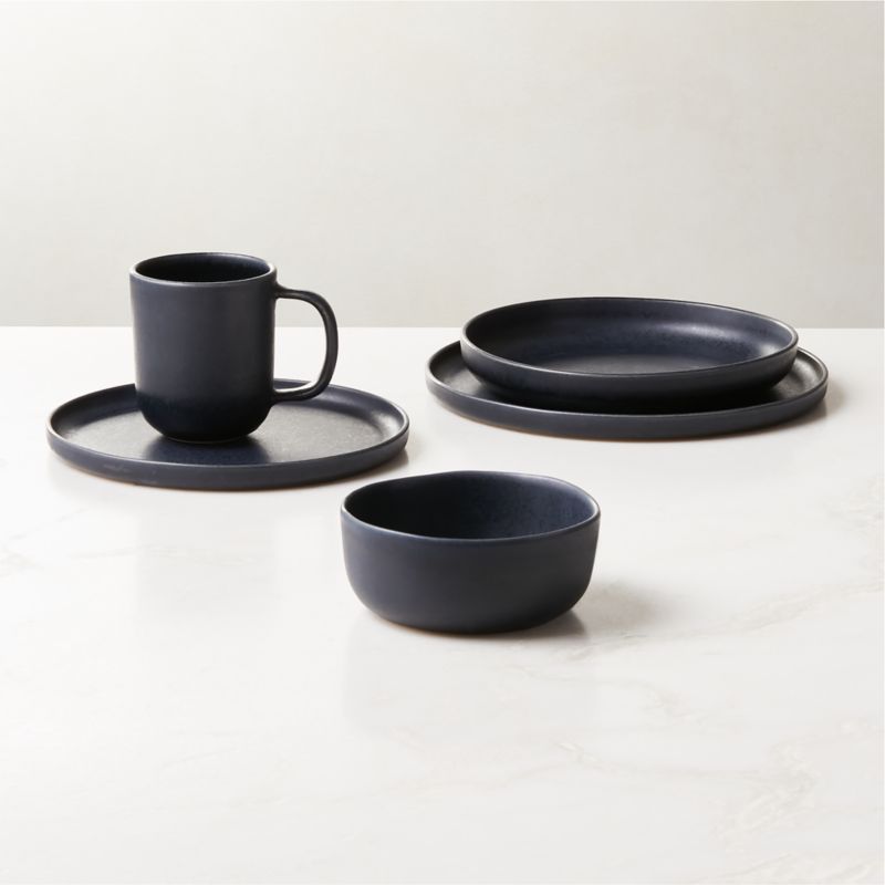 Expert craftsmanship leaves its mark on the Drift Reactive Dark Blue Dinnerware collection. Stoneware forms are hand-pressed and -finished, providing a touch of organic shape. Then they're coated with a matte dark blue water-reactive glaze that behaves beautifully when kiln-fired, surfacing a subtle crackled texture in a dark moody mix that makes each piece unique. CB2 exclusive.