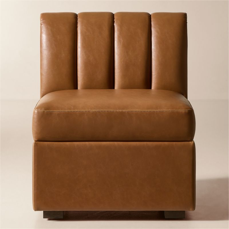 Mermelada Estudio brings sculptural presence to the dining space. Vertical channel tufting adds depth to the backrest, while the streamlined form is equally suited to wall placement or open floor plans. Upholstered in brown bonded leather, it offers a smooth, durable surface that's easy to care for. Solid red oak legs, certified sustainable by the Forest Stewardship Council ® (FSC), are finished in a warm mid-tone stain to ground the piece with natural character. Pieces from the Duncan collection are available individually or in multiples to create a custom banquette configuration. CB2 exclusive.