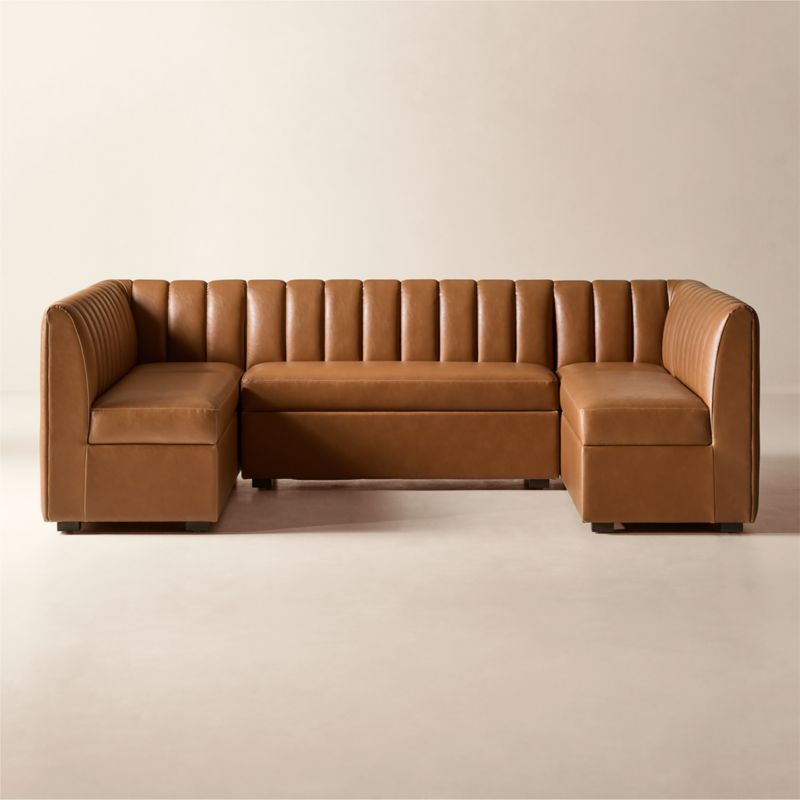 Mermelada Estudio brings sculptural presence to the dining space. Vertical channel tufting adds depth to the backrest, while the streamlined form is equally suited to wall placement or open floor plans. Upholstered in brown bonded leather, it offers a smooth, durable surface that's easy to care for. Solid red oak legs, certified sustainable by the Forest Stewardship Council ® (FSC), are finished in a warm mid-tone stain to ground the piece with natural character. Pieces from the Duncan collection are available individually or in multiples to create a custom banquette configuration. CB2 exclusive.