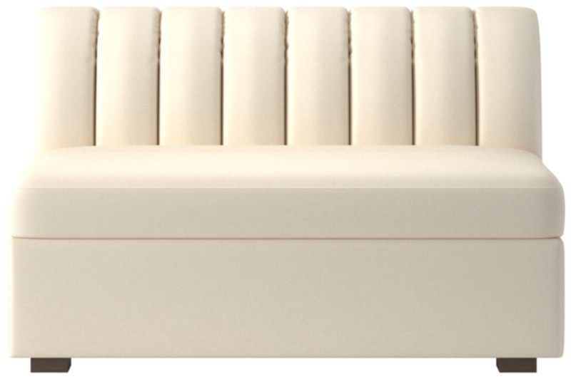 Defined by clean lines and thoughtful proportions, dining banquette bench by Mermelada Estudio brings sculptural presence to the dining space. Vertical channel tufting adds depth to the backrest, while the streamlined form is equally suited to wall placement or open floor plans. Solid red oak legs, certified sustainable by the Forest Stewardship Council® (FSC), are finished in a warm mid-tone stain to ground the piece with natural character. Pieces from the Duncan collection are available individually or in multiples to create a custom banquette configuration. CB2 exclusive.