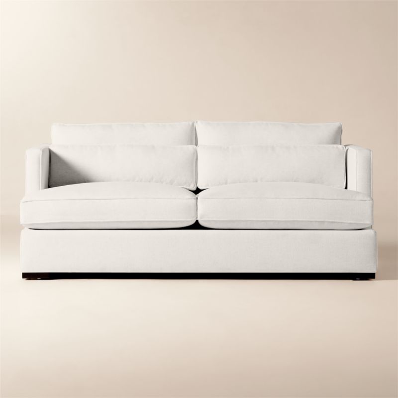 A modern take on the classic family room sofa, this design by Evan Jerry of Studio ANANSI balances timeless comfort with refined tailoring. Hand-assembled in Mississippi with hardwood certified sustainable by the Forest Stewardship Council ® (FSC), its frame is kiln-dried for structure and sturdiness. Upholstered in an easy-to-clean Crypton ® performance fabric, the piece is finished with welt detailing for a clean, structured look. Loose seat and back cushions deliver sink-in softness, while rectangular kidney pillows add extra comfort. CB2 exclusive.