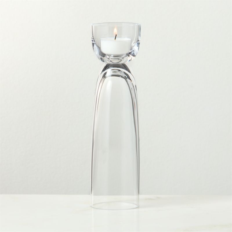 Showcasing a refined silhouette with equally refined materiality, modern candle holder by French industrial designer Aurélien Barbry reflects the warm glow of a tealight candle. Handblown in Poland from high-quality crystalline glass, the candle holder doubles as a bud vase. Mix and match the candle holders with tealights and botanical stems to create a stunning effect. CB2 exclusive.