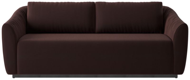 Caleb Zipperer of Zipperer Studio, this deep, enveloping sofa showcases a sculptural silhouette accentuated by gathered detailing along the arms and back. Upholstered in rich dark brown velvet, the fabric's subtle sheen enhances the sofa's gentle curves and dimensional form. Built with wood certified by the Forest Stewardship Council ® (FSC), it rests on a black-stained inset plinth base for a grounded finish. The firm seat cushion is paired with two loose back cushions in a feather and down blend for added comfort and ease. CB2 exclusive.