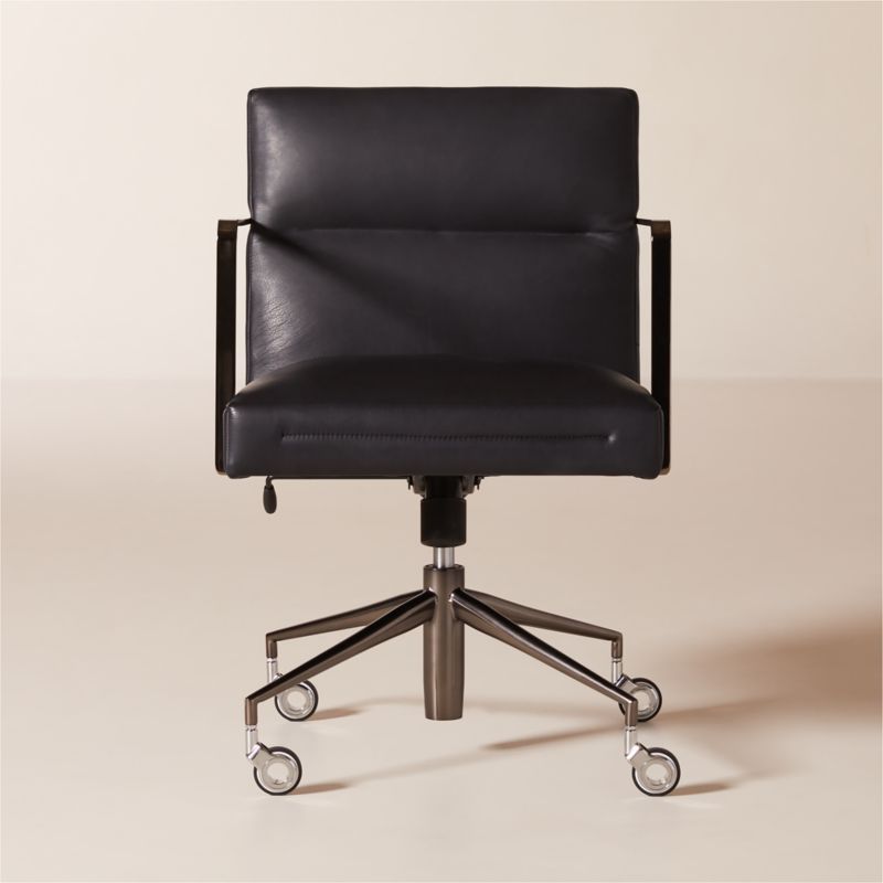 Elevate the workspace with the sleek leather office chair by NYC-based designer Nicholas Obeid. Clad in Moore & Giles full-grain leather, the chair features tight cushioning paired with tailored stitching for a clean, minimalist look. Set atop four rolling casters, the swivel base glides around the office with ease. CB2 exclusive.