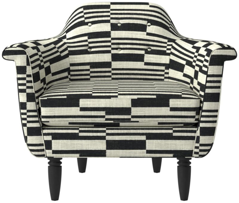 A modern take on the formal button-tufted chair, the Etre Lotus chair takes it easy with subtle curves and angled arms. The deep-seated silhouette is supported by a kiln-dried hardwood frame and turned white oak legs. CB2 exclusive.