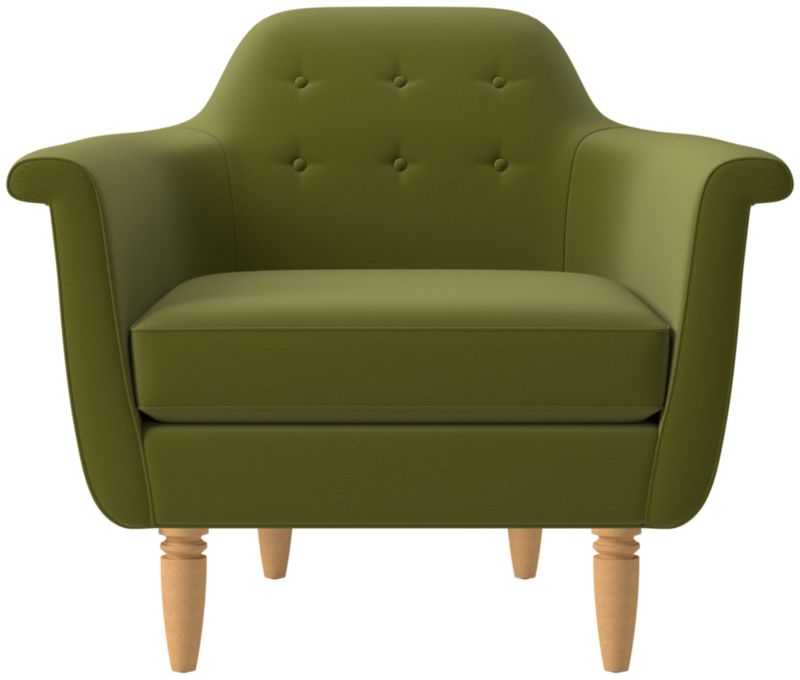 A modern take on the formal button-tufted chair, the Etre Lotus chair takes it easy with subtle curves and angled arms. The deep-seated silhouette is supported by a kiln-dried hardwood frame and turned white oak legs. CB2 exclusive.