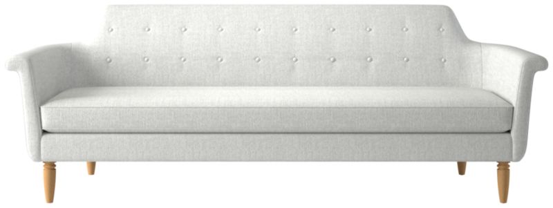 A modern take on the formal button-tufted sofa, the Etre sofa takes it easy with subtle curves and angled arms. The deep-seated silhouette is supported by turned white oak legs. CB2 exclusive.