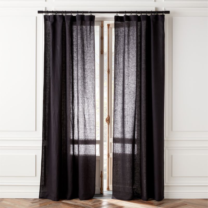 Light-filtering linen drapery is woven from natural flax grown in Europe. Full-length in black. Hangs beautifully with back tabs, rod pocket or drapery hooks. CB2 exclusive.