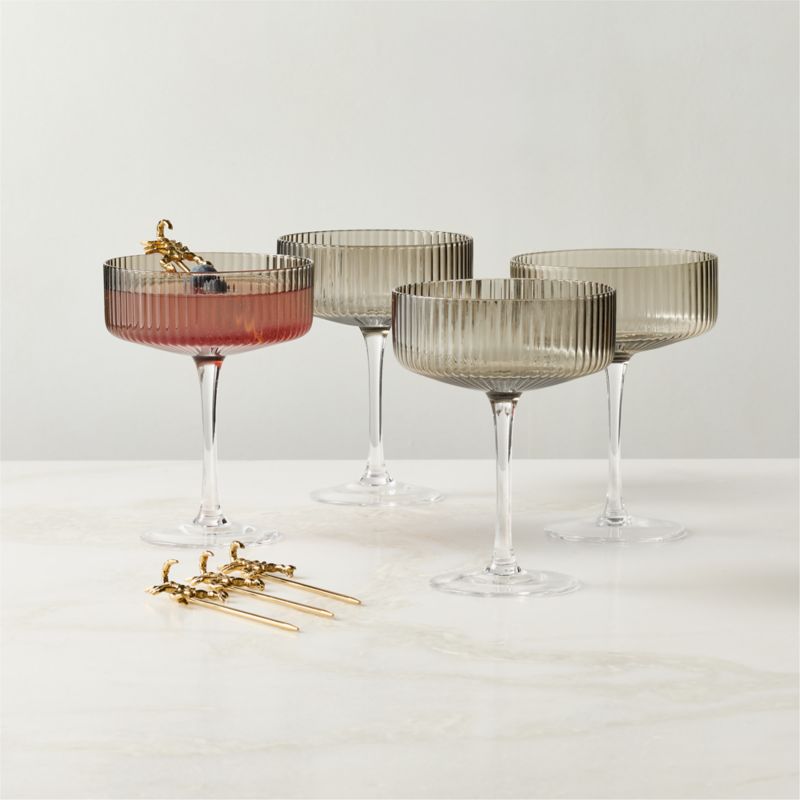 Our most popular cocktail glass in a smoky hue. The short, flat-rimmed coupe features optic texture all around the glass. Makes the perfect moody cocktail glass or extra fancy dessert/parfait bowl. The smokey hue may feature slight variation due to the nature of the production of the glass. Includes four Eve smoked coupe glasses and cast brass scorpion cocktail picks to make a perfect gift. CB2 exclusive.