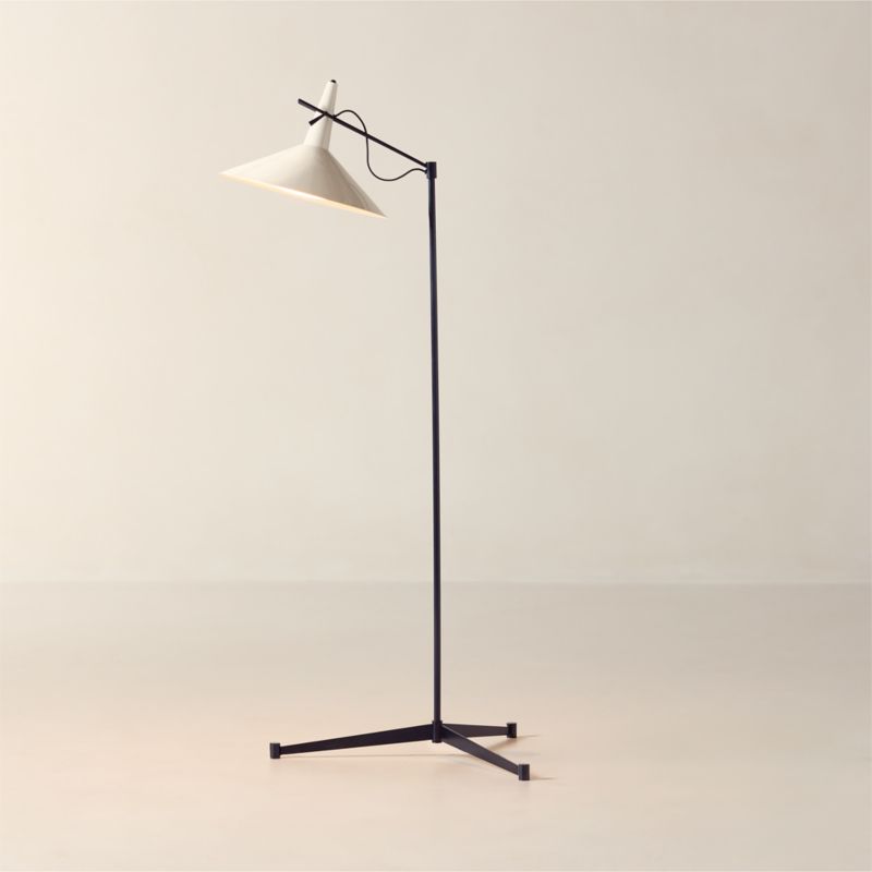 Striking floor lamp debuted as part of Paul McCobb's second series of lighting, first introduced in 1952 and just as stunning today. Faithfully reproduced to mirror McCobb's original, its solid blackened brass tripod base supports a warm white enameled shade. Functional details like the light switch, fasteners and angle adjuster have been fabricated to match their midcentury predecessors. Each major component is a custom design unique to Paul McCobb lighting. CB2 exclusive.