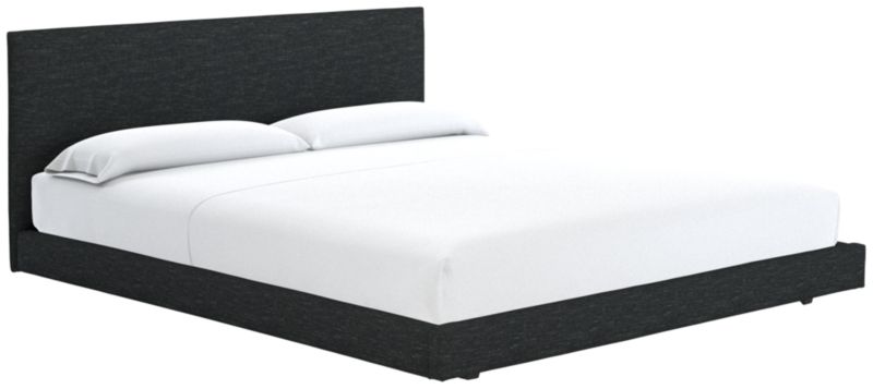 Clean box silhouette sleeps hi-fashion in soft white linen-y weave. Dreamy in hi/lo proportions: Slim cushioned headboard scales up for comfy reading in bed on low-profile frame. Tailored neat all the way around so it can float in the room. CB2 exclusive.