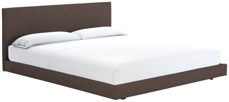 Clean box silhouette sleeps hi-fashion in soft white linen-y weave. Dreamy in hi/lo proportions: Slim cushioned headboard scales up for comfy reading in bed on low-profile frame. Tailored neat all the way around so it can float in the room. CB2 exclusive.