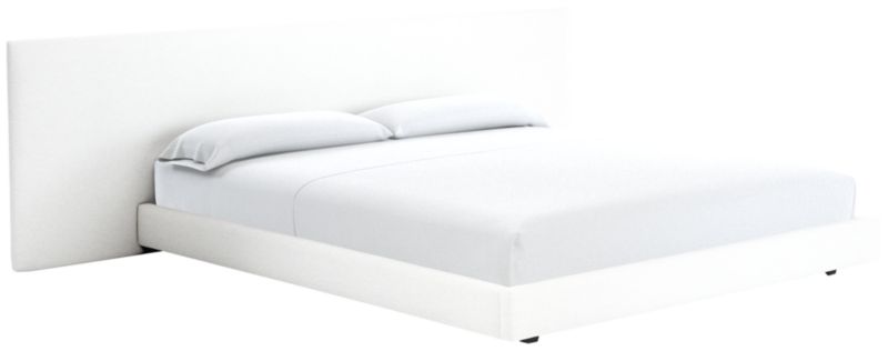 A study in proportion and restraint, bed pairs a clean box silhouette with exceptional materials. Solid maple wood frame supports a slim cushioned headboard scaled for comfort and extended wide to accommodate nightstands. The tailored design features a fully upholstered back, allowing it to float within a room. CB2 exclusive.