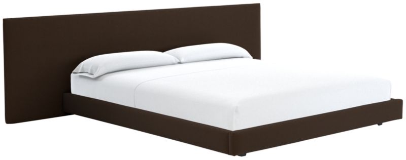A study in proportion and restraint, bed pairs a clean box silhouette with exceptional materials. Solid maple wood frame supports a slim cushioned headboard scaled for comfort and extended wide to accommodate nightstands. The tailored design features a fully upholstered back, allowing it to float within a room. CB2 exclusive.
