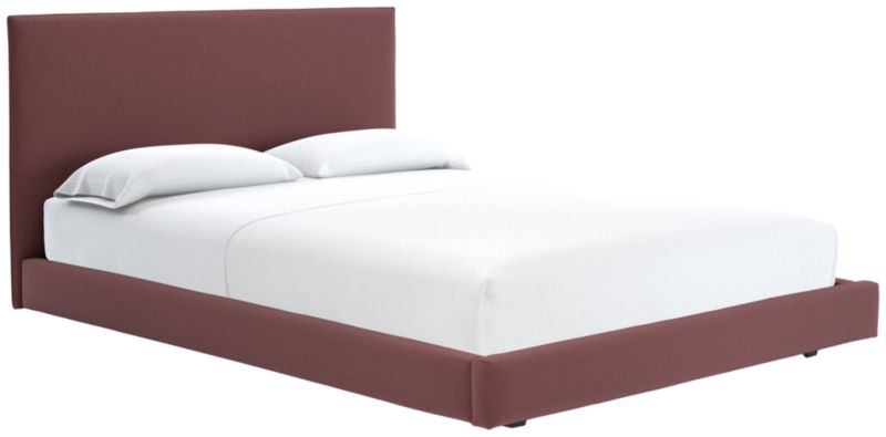 Clean box silhouette sleeps hi-fashion in soft white linen-y weave. Dreamy in hi/lo proportions: Slim cushioned headboard scales up for comfy reading in bed on low-profile frame. Tailored neat all the way around so it can float in the room. CB2 exclusive.