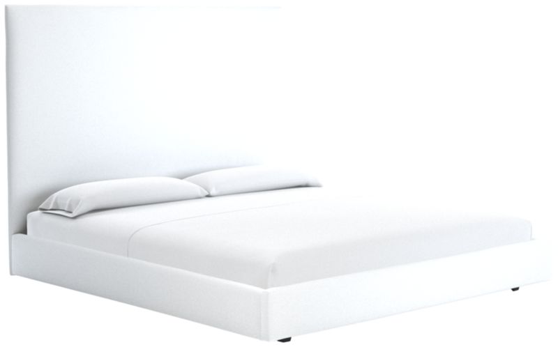 A study in proportion and restraint, bed pairs a clean box silhouette with exceptional materials. Solid maple wood frame supports a slim cushioned headboard scaled for comfort and dramatic height. The tailored design features a fully upholstered back, allowing it to float within a room. CB2 exclusive.