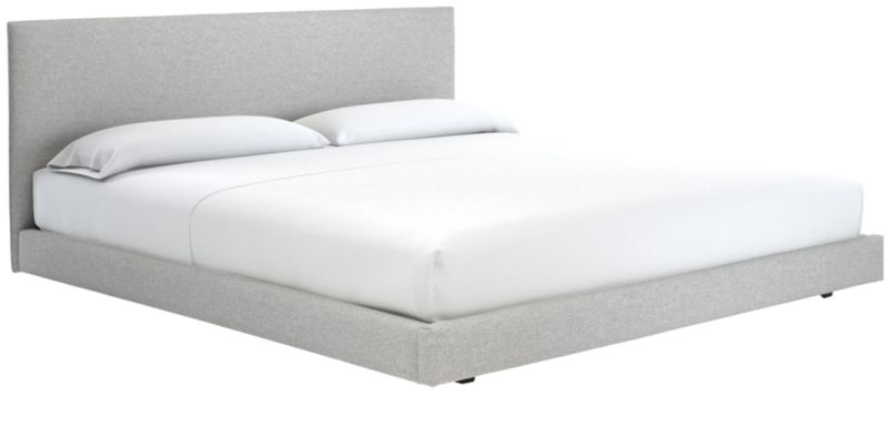 Clean box silhouette sleeps hi-fashion in soft white linen-y weave. Dreamy in hi/lo proportions: Slim cushioned headboard scales up for comfy reading in bed on low-profile frame. Tailored neat all the way around so it can float in the room. CB2 exclusive.